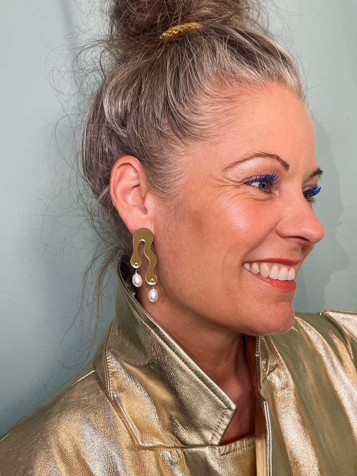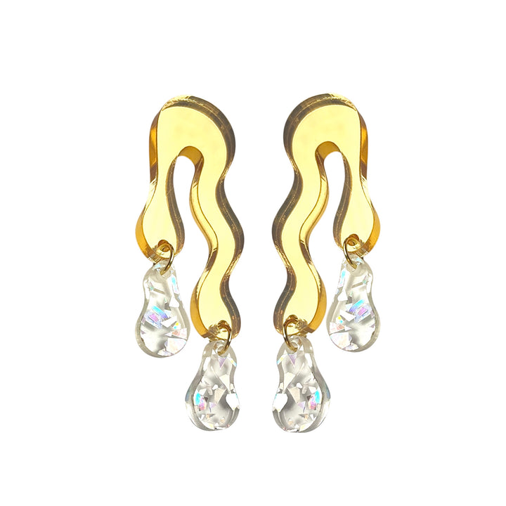 Beautiful holographic drops, dripping from a golden double drop with earstud.
