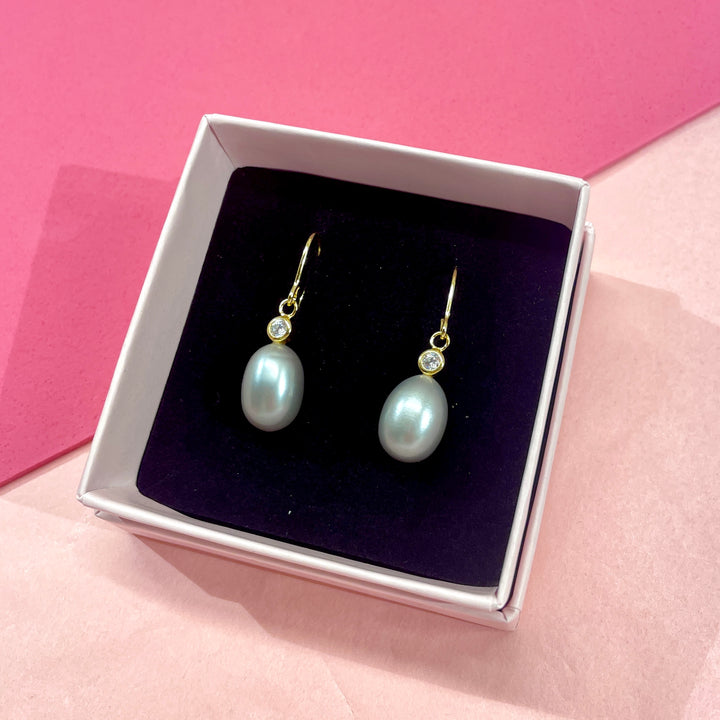 Delicate, golden and full of charm. Cool earrings with with beautiful large grey pearls. Only 2 pairs available!This design is both classic and modern!